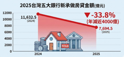 中央銀行昨(22)日公布最新金融統計數據,揭示政府打炒房政策成效顯著。台灣五大銀行(台銀、合庫銀、土銀、華銀及一銀)在2025年全年新承做購屋貸款金額為7,694.5億元,較2024年大幅減少3,938億元,年減幅高達33.8%,全年總量跌破8,000億元大關。儘管12月受年底交屋潮影響出現短期回溫,但整體市場已明顯從熱絡轉向冷靜。